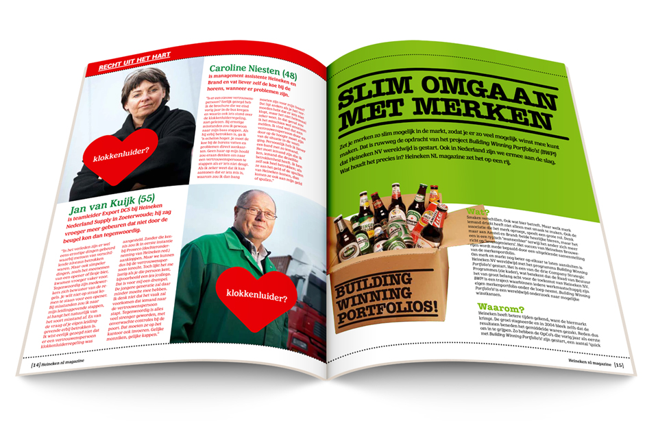 The visual identity is designed to clearly communicate with the workforce and make leadership clear and transparent, enabling staff to get a new outlook on how core values can be expressed. The applied colors reflect the variety of Heineken in the Netherlands by referring to the group's entire range of beer and soft drink brands. The visual identity is expressed through various communication tools. The new corporate magazine, the annual social report and the magazine for former employees. The redesign will be applied to Heineken's intranet and the decentralized newsletters as well. At the Dutch Grand Prix is Heineken NL magazine chosen to be the best Dutch company magazine.